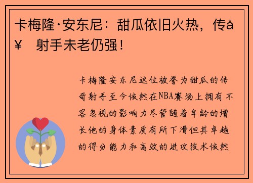 卡梅隆·安东尼,这位被誉为“甜瓜”的传奇射手,至今依然在NBA赛场上拥有不容忽视的影响力。尽管随着年龄的增长,他的身体素质有所下滑,但其卓越的得分能力和高效的进攻技术,依然使他在联盟中占据一席之地。本篇文章将通过多个角度分析卡梅隆·安东尼的现状,探讨他为何能够在37岁的年纪依旧保持火热状态,并且展望他未来的可能表现。首先,我们将回顾安东尼的个人历史和技术特点,继而分析他在不同球队中的表现,再看看他如何在如今的NBA环境中依旧保持竞争力,最后总结其传奇地位的未来趋势。
